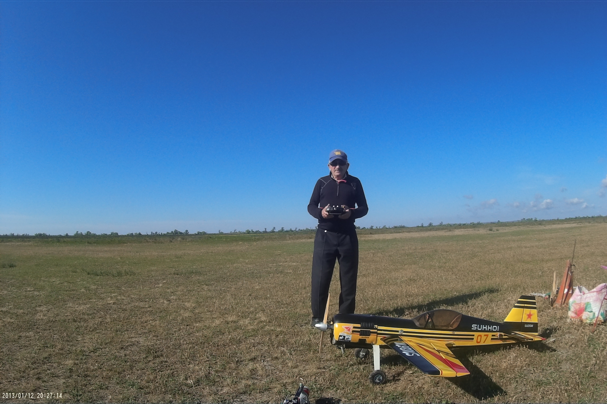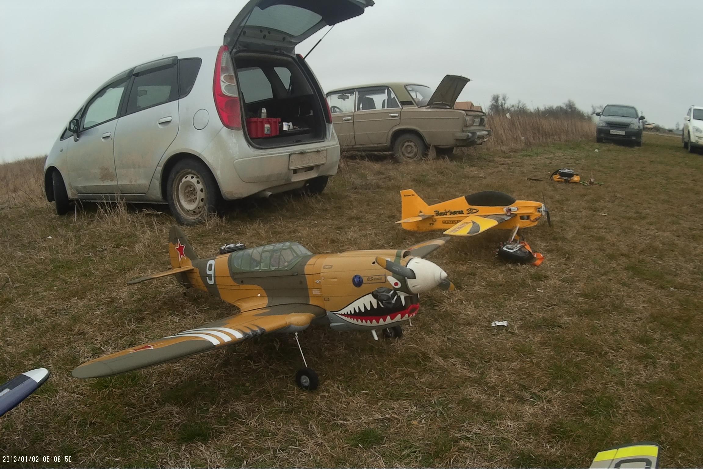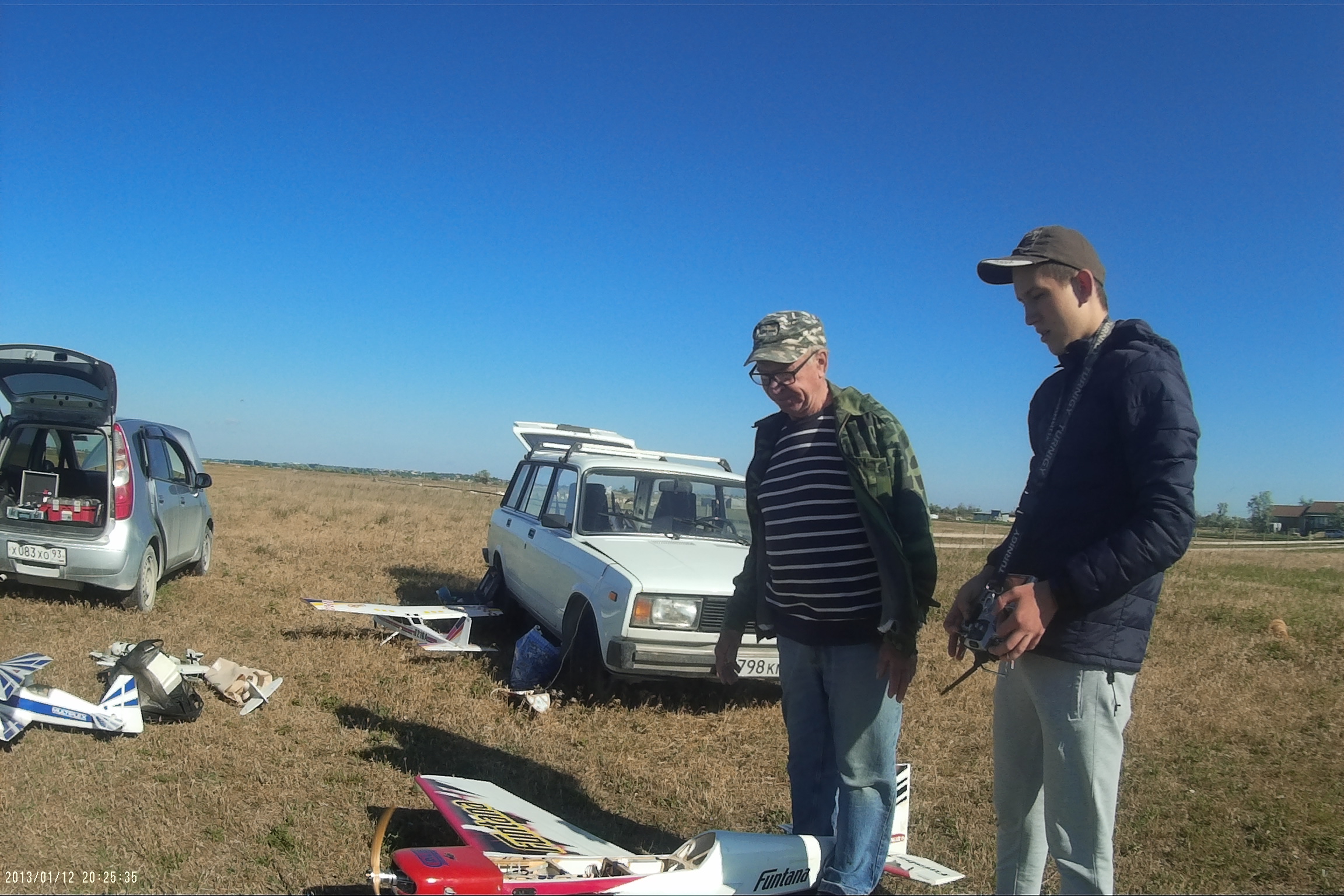 Приветствую всех пилотов! Спешу сообщить новость, Геленджик, Темрюк и Витязево на выходных побывали в гостях у Бориса Борисовича. На первый взгляд показалось, что погода была не летная, однако, после запуска нескольких самолетов выяснилось, что ветер 12м/c не помеха даже для самолетов СОЮЗ 500. Виктор Дмитриевич и, собственно, я ( Пашка) привезли из Геленджика 4 самолета: тренер CANARY, FUNTANA 125G, ЮПИТЕР ЮНИОР и гвоздь программы - FRENZY 100 с двигателем saito 100. Самолет обладает невероятными летными качествами, после капитального ремонта, проведенного Виктором Дмитриевичем, самолет стал весить чуть больше 3кг, напомню, что у данного аппарата отсутствовала "морда" и половина крыла. Не было никаких чертежей. Только закончив ремонт модели, удалось узнать ее название ( получилось случайно). Лучший механик Геленджика постарался, чтобы все параметры самолета сохранились, так оно и получилось. Полетали на бензине, Funtana и СУ 26. Все было в норме. Другие пилоты были с бипланами, а пилот из Витязево, Евгений привез самодельную копия 3D самолета ЯК54, которая летала очень уверенно, несмотря на сильный боковой ветер. Но больше всего меня впечатлили маленькие самолеты, весом 250г, изготовленные по бутылочной технологии СОЮЗ 500. Борис Борисович предоставил мне для боя немецкий самолет FW 190, А сам он летал на ЯКе и Ла5. Еще один местный пилот Александр сражался на биплане, а Евгений решил идти в бой на MUSTANG и МИГ. Скажу честно, если бы так сражались пилоты СССР и Америки, то наше существование было бы под большим вопросом.